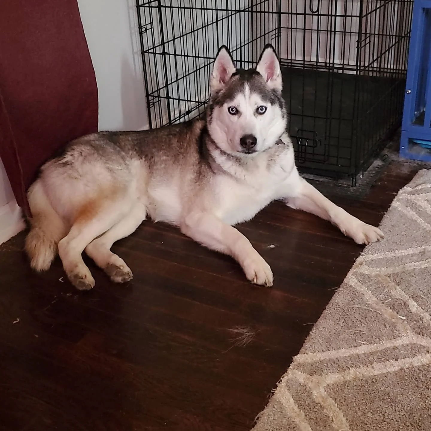Finn, my first dog, posing in front of his crate